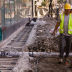 A contractor works on sidewalk replacement outside the New Mart building, at 9th and Los Angeles.