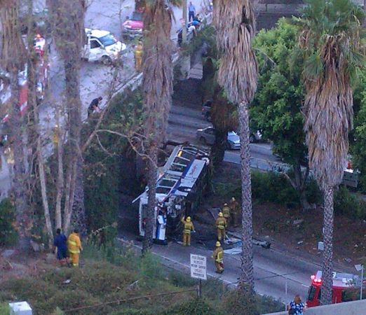 The out-of-service bus was a hybrid-electric bus purchased in 2009. It was parked on 5th Street when it rolled back and landed onto the shoulder area of the Harbor Freeway below, confirmed the bus line.