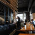 Architect Anna Henton of MASS Architecture & Design used the space's 24-foot-high ceiling to full advantage, installing staggered wooden shelves behind the bar and filling them with colored glass bottles. Wood is Corkbar's dominant element. The tabletops are made from reclaimed eucalyptus, elm and hickory provided by woodworker Chris Taus. The bar has 2,200 square feet inside and 800 square feet of patios. Ceiling-high windows give the spot lots of daytime light, which Hoffman notes gives the bar "two unique feels and vibes" between day and night.