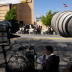 Media observes from across Temple street as the casket holding actress Farrah Fawcett is led into the Cathedral of Our Lady of the Angels.