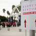 A sign points to the Barney's Warehouse Sale in the Convention Center. In the background, fans line up for the NBA All-Star Jam Session.